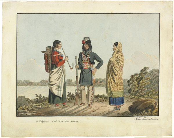A Métis and his two wives, Peter Rindisbacher, ca. 1825-1826. Source: Library and Archives Canada.
