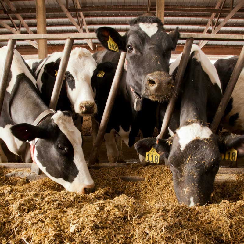 The most common breed of dairy cattle is Holstein; these are the black and white cows you probably picture when you think of a cow. Many dairy farmers raise their dairy cattle in open-sided “freestall” barns where cows eat, drink, sleep and move around as they like. Milking is done with machines in a separate parlor. Milk is cooled, tested for safety and quality, and pasteurized before it makes it to the store.